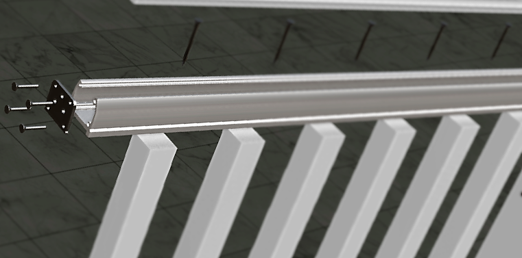 Step 6. Determine the position of the support legs in relation to the balusters. NOTE: The supports are 4" for 28’’ balusters @ 36’’ rail height. The recommended space for the support legs is 4’ +/-. Drill ¼’’ holes and attach 4’’ support legs to the bottom aluminum insert with 2 ½’’ screws (Photo 3).